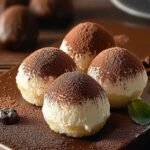 Kurz vor dem Servieren die kalten Tiramisu Kugeln großzügig mit ungesüßtem Kakaopulver bestäuben. Die Kakaoschicht sollte eine feine, gleichmäßige Decke bilden. Servieren Sie die Kugeln sofort, um den Temperaturkontrast zwischen der kühlen, cremigen Füllung und der leicht trockenen Kakaohülle optimal zu genießen.